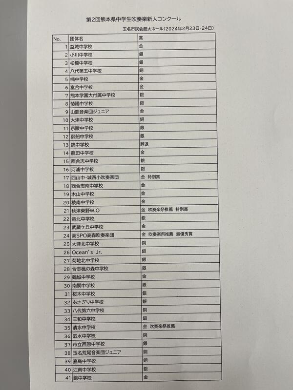23日(金)、24日(土)に開催された第2回熊本県中学生吹奏楽新人コンクールで見事最優秀賞を受賞しました。