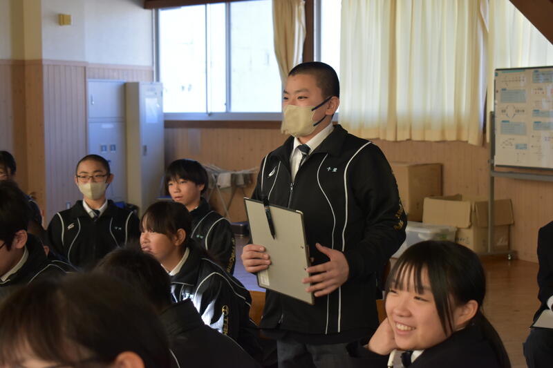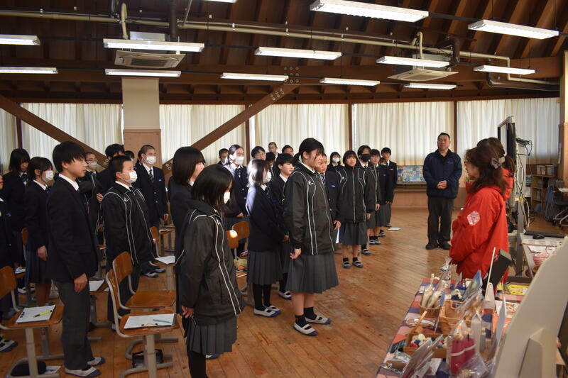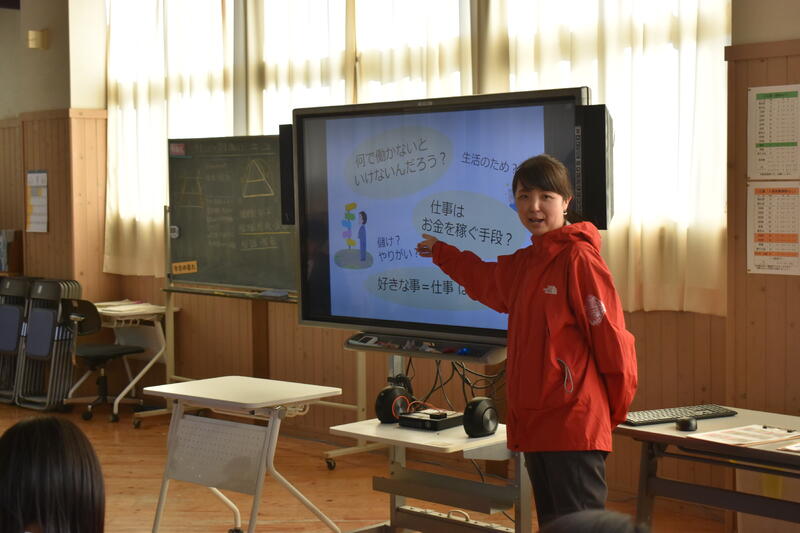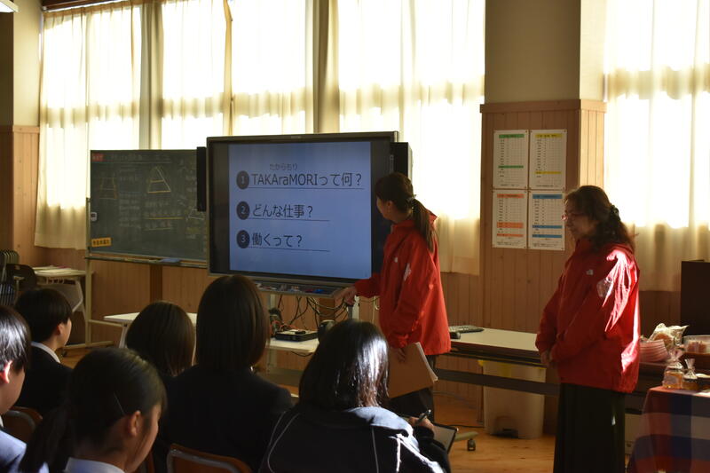 本日の5~6校時、1年生では「働く」ことについて、地域の方をお招きし「職業講話」をしていただきました。講師として、一般社団法人たのしく暮らす(TAKAraMORI)から2名きていただき、地域で働く方の仕事内容や、地域の実情をお話ししていただきました。