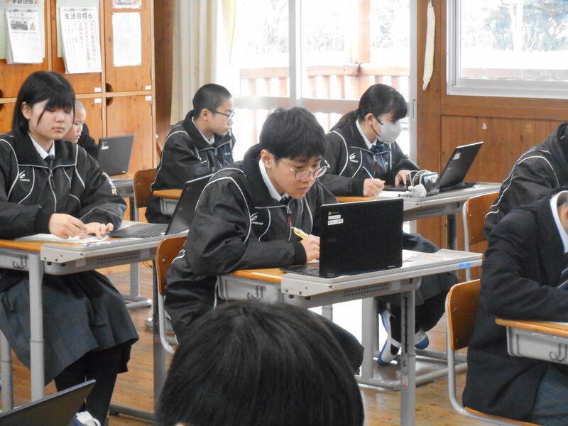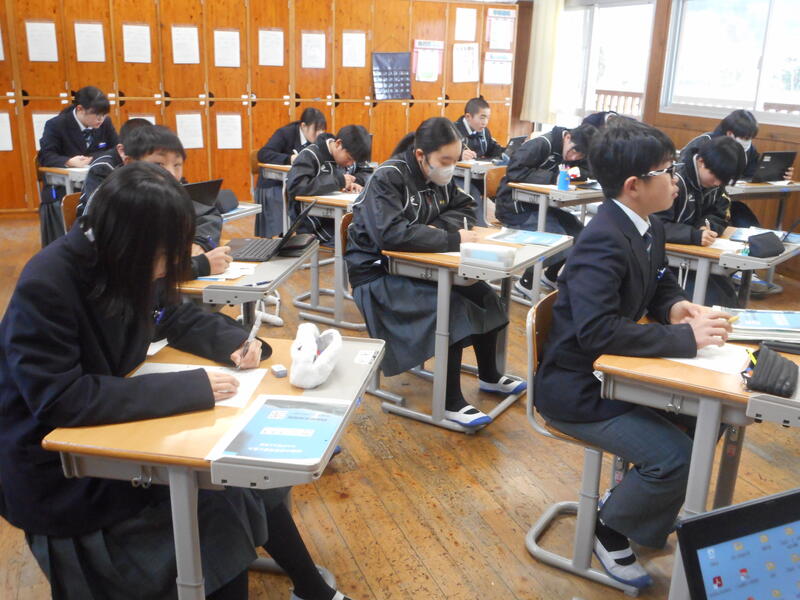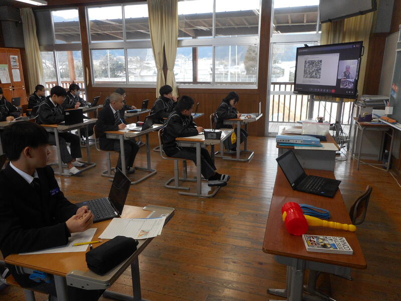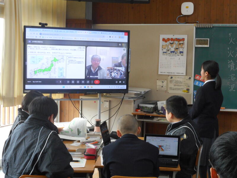 23日(金)の午前中、1年生は、「阿蘇の自然災害と恵み『火山の噴火と災害』」についての学習を行いました。本来であれば、阿蘇総合博物館へ行き、現地で学習を行う予定でしたが、雪による道路状況から、急遽オンラインでの学習となりました。博物館の方が講師として、日本全国にある火山の数や火山の噴火により起こる災害等について、様々な視点から学習していきました。