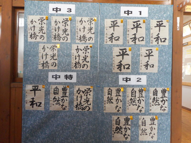 先週お伝えしましたが、“阿蘇郡市南部書写展” が開催され、本校から多くの生徒の作品が入賞しました。本日、巡回展示として、入賞した生徒たちの作品が届きました。早速、校長室前に掲示しています。ぜひ、生徒たちの作品をご覧にきていただけたらと思います。