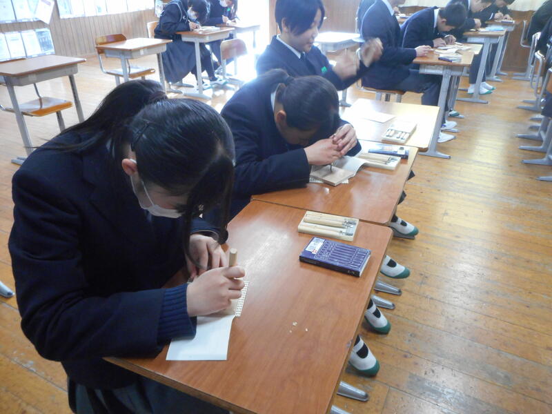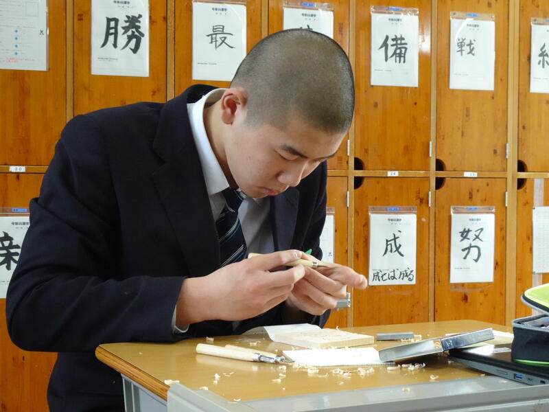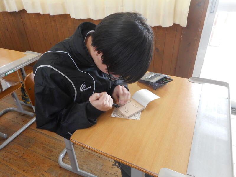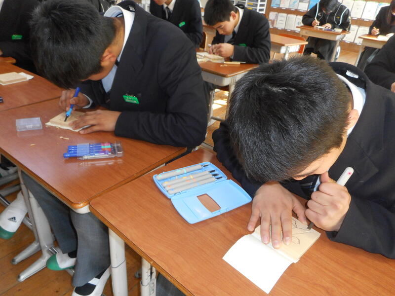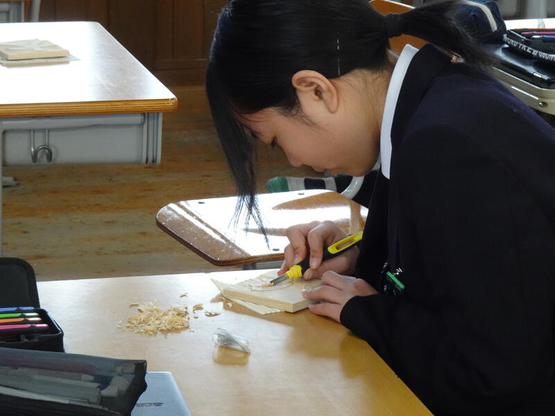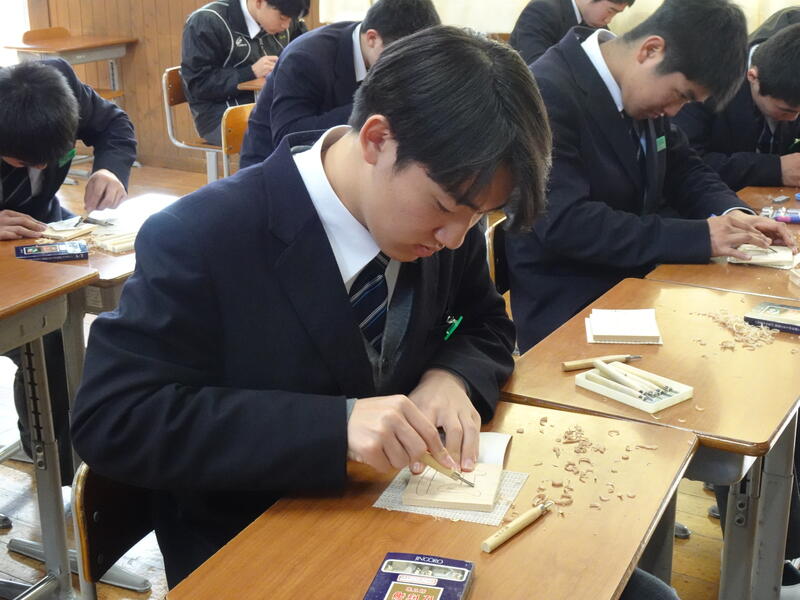 受験シーズンも本格的になっている中、3年生は本日から全員で卒業制作に取りかかりました。体育館に掲示してある校歌が見えずらいということで、今年度は校歌の歌詞を1文字ずつ10cm四方の板に彫刻刀で手彫りで制作していき、それらを合わせて校歌全体を掲示します。最初に早川先生から説明があり、その後、生徒たちによる作業が始まりました。卒業式当日までには体育館に掲示する予定ですので、完成した際にはぜひご覧ください。