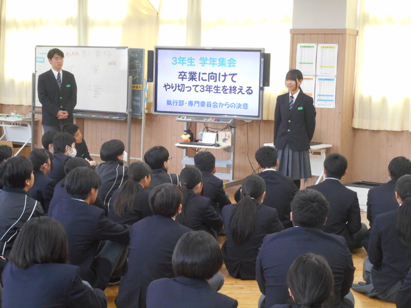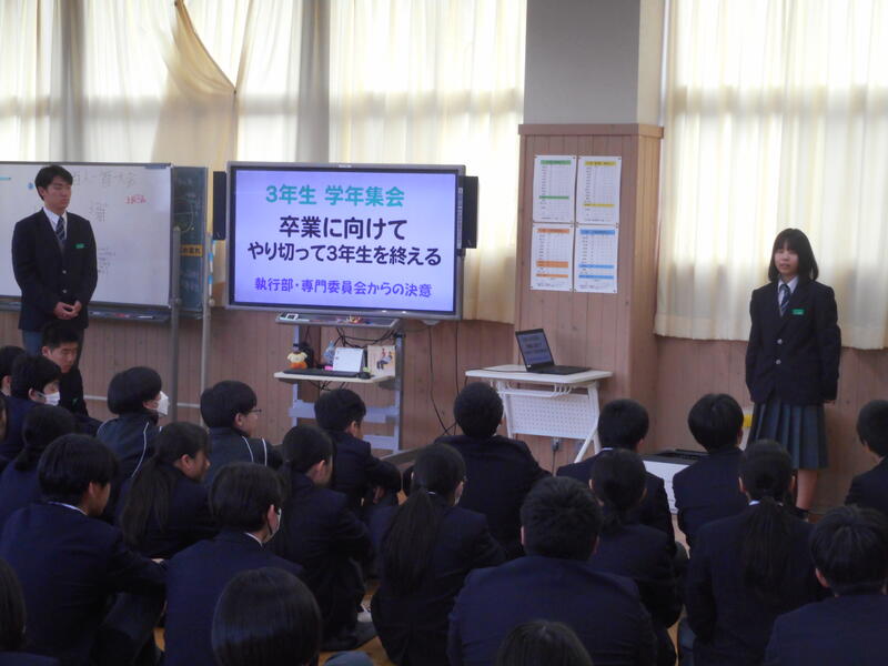 この日は、防寒対策からオンラインで【2学期前半終了全校集会】を実施しました。表彰・各学年代表生徒意見発表等々を行い、その後学年集会を開きました。約2週間の冬休みになりますが、充実した休みを過ごしてほしいと思います。