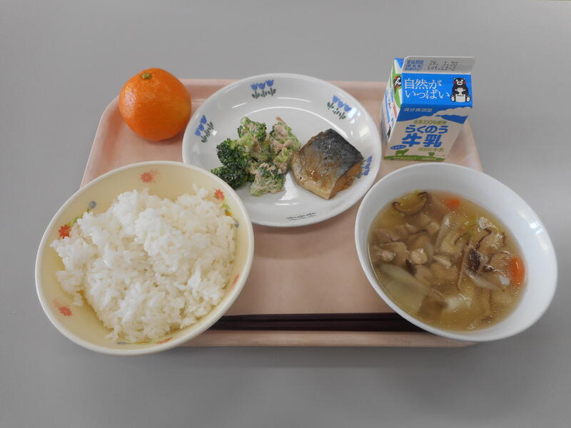 今日の給食のメニューは、【牛乳、白ごはん、せんべい汁、さばのゆずみそ煮、ブロッコリーサラダ、みかん】です。本日は、“リクエストメニュー第5位” になります。調べてみたところ、“せんべい汁” は、もともと青森県八戸市周辺の郷土料理ということで、私はあまり馴染みのないメニューです。食べてみると、だしの染み込んだせんべいはもっちりとした独特の食感で、野菜や鶏肉、きのこなど様々な具材と一緒に食べられ、とても美味しい一品でした。また、“ブロッコリーサラダ” も、シャキシャキ感もあり、美味しくいただきました。今週もありがとうございました。