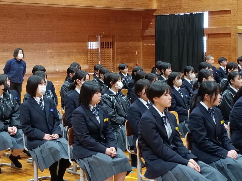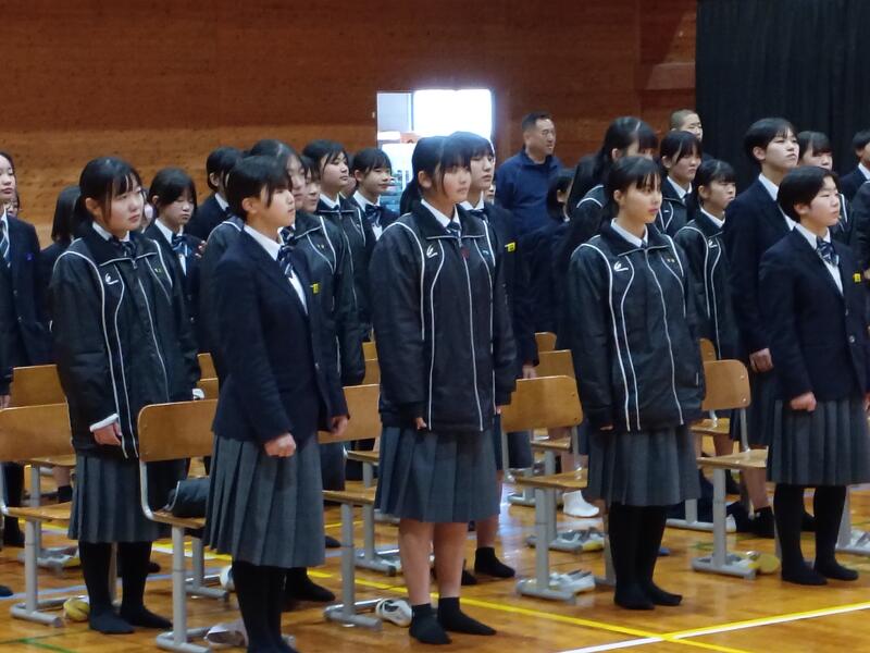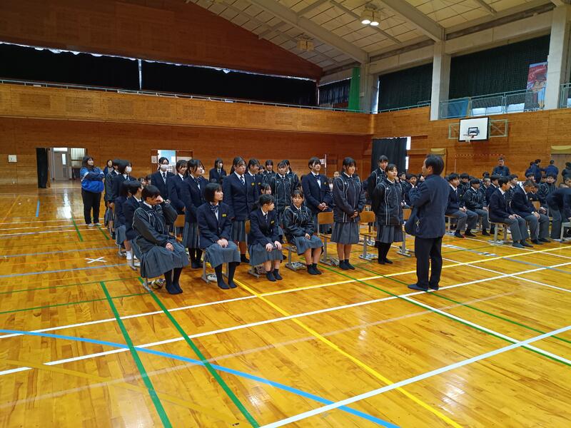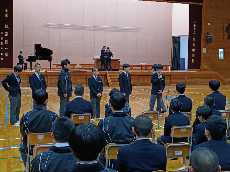 さて、今週末(7日(土))は卒業式です。昨日、卒業式に向けて、在校生の1回目の練習が行われました。式全体の流れの確認や歌の練習を中心に行いましたが、真剣に取り組む様子が見られました。お世話になった3年生を全校生徒で送っていこうと思いがしっかりと伝わる練習でした。