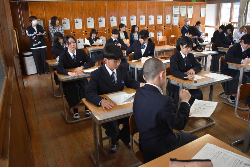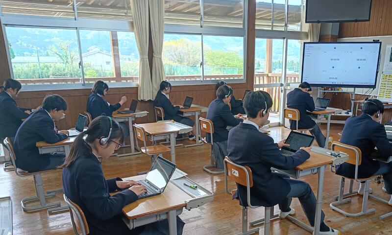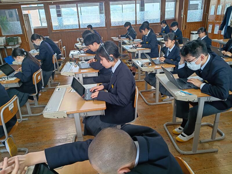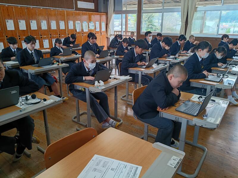 本日3年生は、1、2校時に “全国学力・学習状況調査” が実施されています。1校時に様子を見に行くと、英語が行われており、ヘッドセットを付けて、真剣な眼差しで取り組んでいる3年生の姿が見られました。今後、別日に2日実施されます。