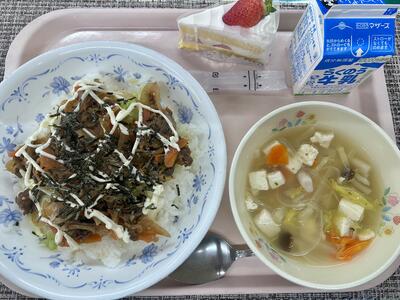 本日のメニュー:シシリアンライス、白菜ときのこのスープ、お祝いケーキ、牛乳