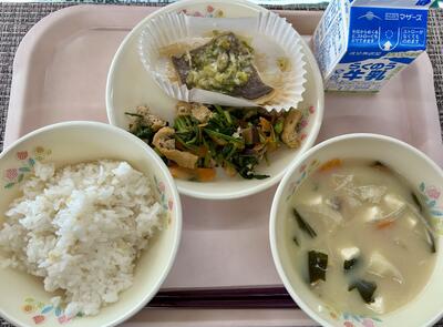 本日のメニュー:麦ごはん、大根のみそ汁、魚の香味ソースかけ、菜焼き、牛乳