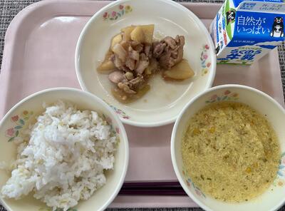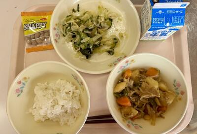 本日のメニュー:麦ご飯、豚肉じゃが、海藻サラダ、黒糖ビーンズ、牛乳