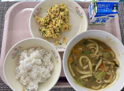 本日のメニュー:麦ごはん、カレーうどん、カロテンサラダ、牛乳