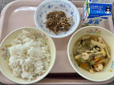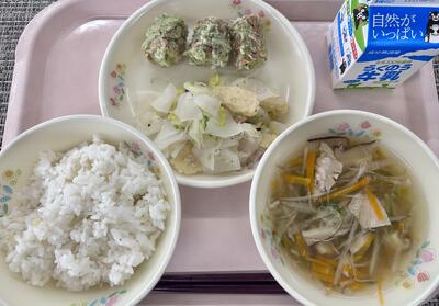 本日のメニュー:麦ご飯、沢煮椀、ちくわの磯辺揚げ、南関揚げとしらすのサラダ、牛乳