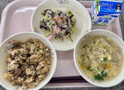 本日のメニュー:ひじきキムチチャーハン、中華風かき玉スープ、バンサンスー、牛乳