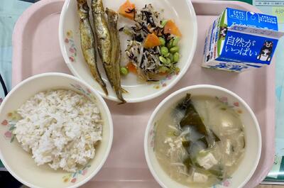 本日のメニュー:麦ご飯、豆腐のみそ汁、ししゃものカレー焼き、ひじきと枝豆のごま酢あえ、牛乳
