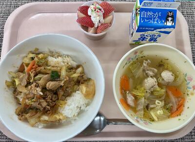 本日のメニュー:回鍋肉丼、ABCスープ、お祝いカフェオレゼリー、牛乳
