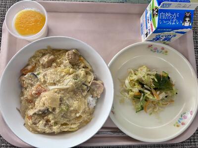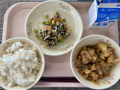本日のメニュー:白ご飯、高野豆腐の卵とじ、ゆかり和え、牛乳
