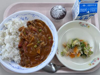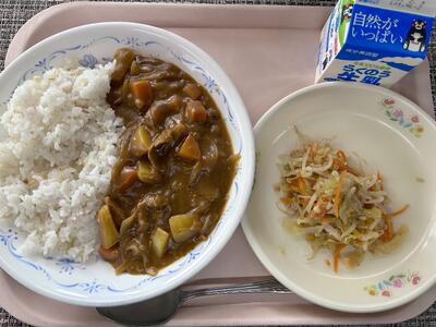 本日のメニュー:チキンカレーライス、ひじきのごま酢あえ、牛乳