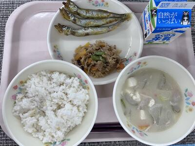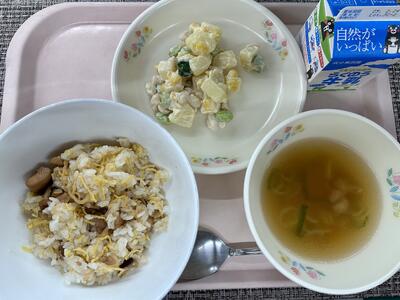 本日のメニュー:きのこの混ぜごはん、みそけんちん汁、ごまネーズ和え、牛乳