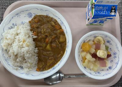 本日のメニュー:ポークカレーライス、フルーツミックス、牛乳