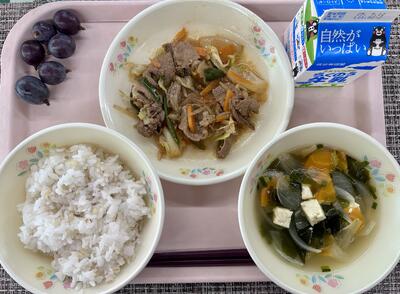本日のメニュー:麦ご飯、わかめスープ、和牛焼肉ソテー、ぶどう、牛乳