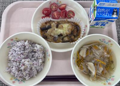 本日のメニュー:ゆかりごはん、沢煮椀、なすのチーズ焼き、ミニトマト、牛乳
