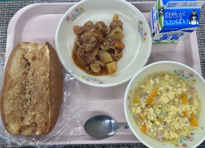 本日のメニュー:食パン、コーンクリームシチュー、カミカミごぼうサラダ、牛乳