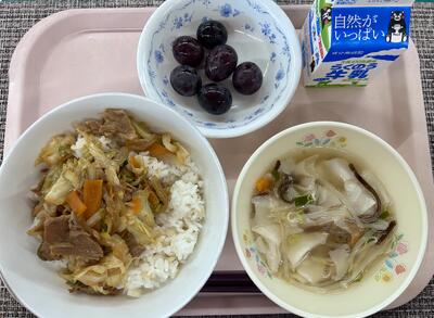 本日のメニュー:回鍋肉丼、ワンタンスープ、ぶどう、牛乳