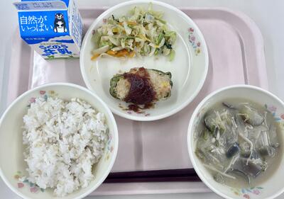 本日のメニュー:麦ご飯、きのこけんちん汁、魚のサザレ焼き、南関あげとしらすのサラダ、牛乳