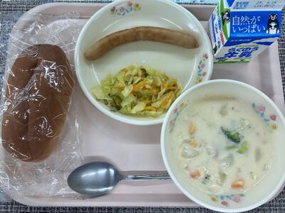 本日のメニュー:セルフドック(コッペパン、ウインナー、野菜ソテー)、クリームシチュー、牛乳