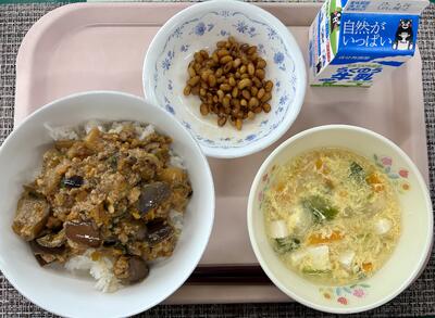本日のメニュー:マーボーなす丼、チンゲン菜と卵のスープ、ざぜん豆、牛乳