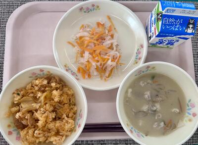 本日のメニュー:ツナひじきごはん、野菜たっぷりスープ、里いものクリームグラタン、牛乳