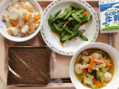 麺類や洋食は、和食献立の時に比べ噛む回数が少なくなると言われていることから、今日はサラダにちりめんを入れて作りました。時代の移り変わりの中で、少しずつ変化している日本人の食事ですが、給食ではよく噛んで食べられるように具材を大きめに切ったり、よく噛んで食べる食材を入れたりと工夫しています。しっかり噛んであごの運動をしましょう。