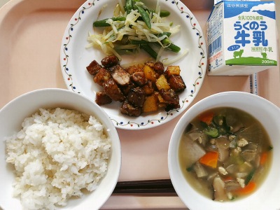 今日は大豆を使った混ぜご飯です。大豆は古くから日本人にとって欠かせないたんぱく源でした。畑のお肉と呼ばれる大豆は、脂肪の吸収を防ぎ、カルシウム・鉄分・ビタミン・食物繊維などを補ってくれます。給食では、大豆やその他の豆類や大豆製品を、なるべくたくさん使うようにしています。それは、みなさんが大きく元気に成長するために必要な栄養をたくさん含んでいるからです。
