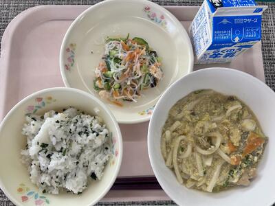 本日のメニュー:わかめごはん、親子うどん、春雨の酢の物、牛乳