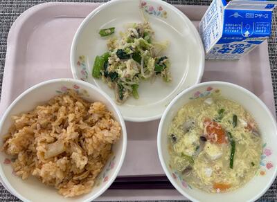 本日のメニュー:キムタクごはん、かきたま汁、ピーナッツあえ、牛乳