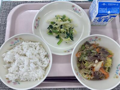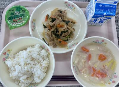 本日のメニュー:麦ごはん、白菜のみそ汁、豚肉と小松菜のにんにく醤油炒め、ほうれん草ムース、牛乳