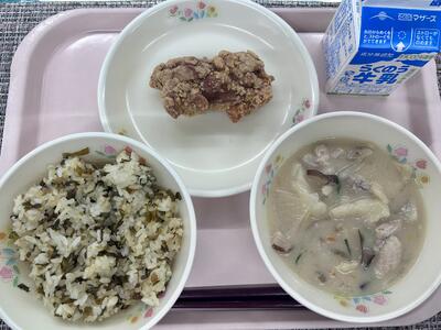 本日のメニュー:高菜めし、団子汁、鶏の唐揚げ、牛乳