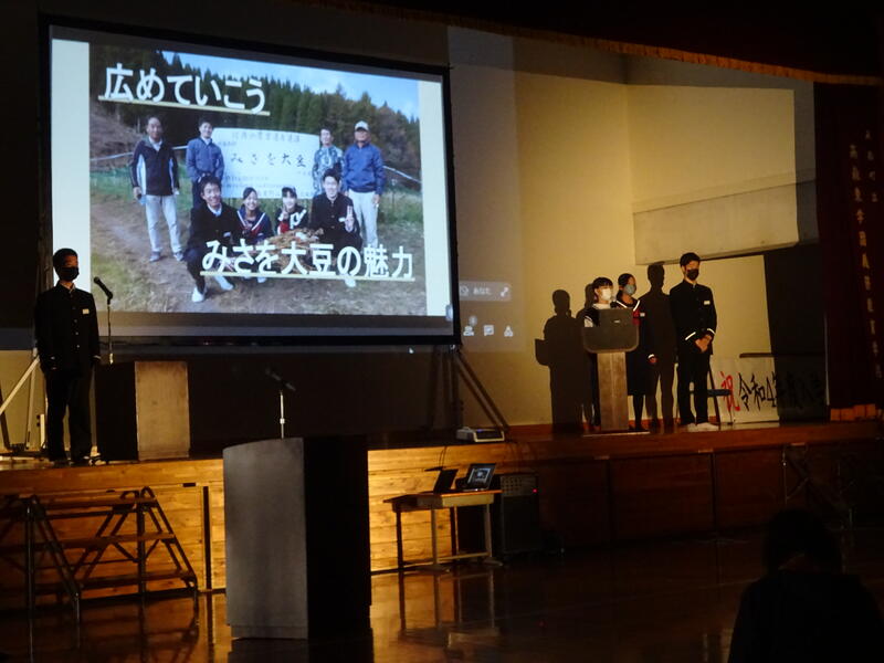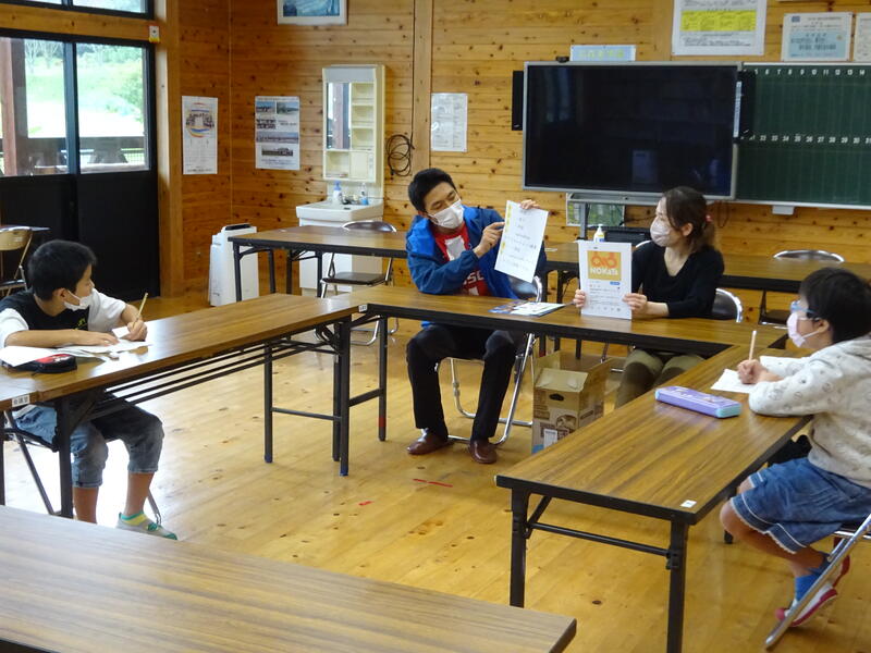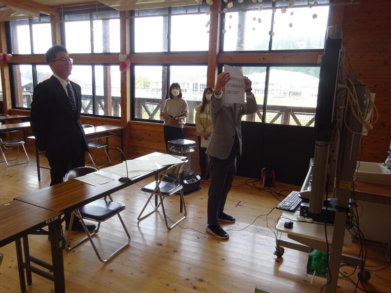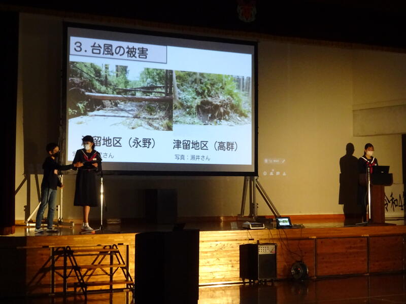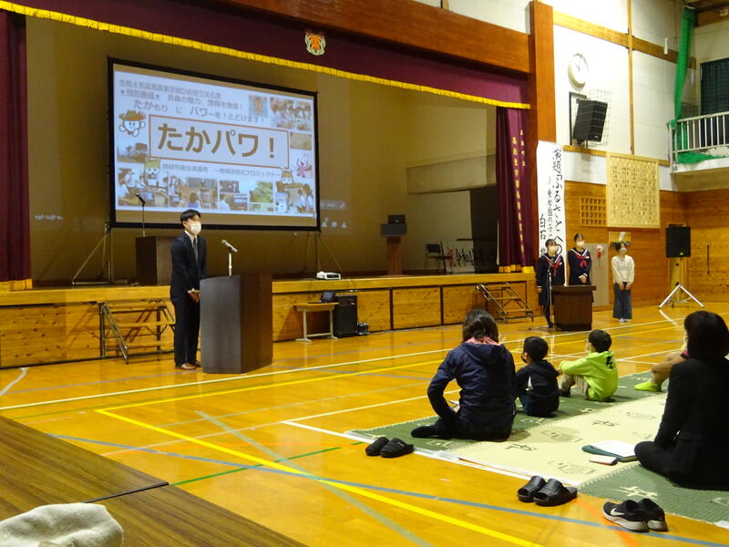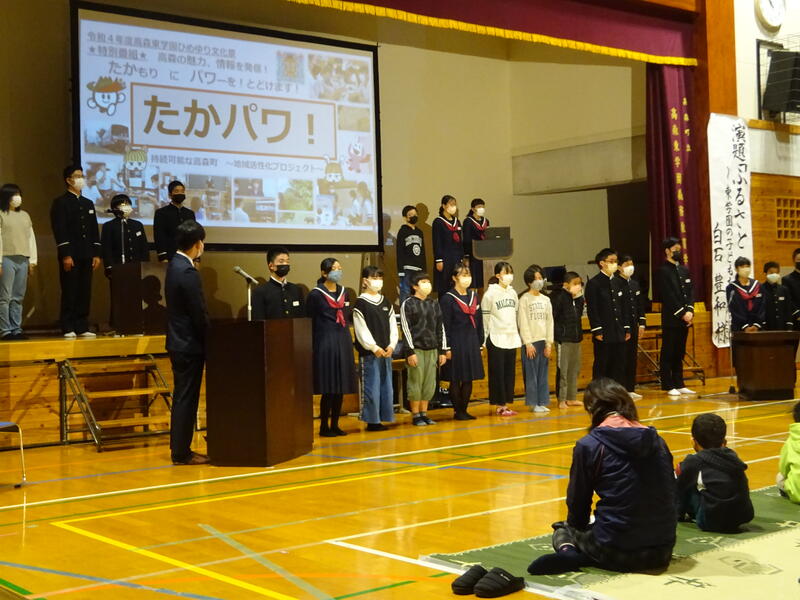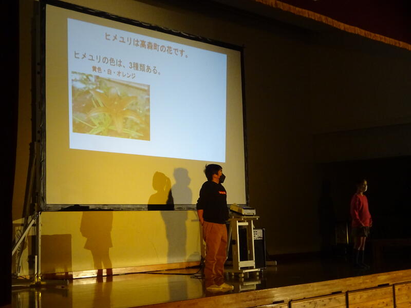 5~9年生は、「持続可能な高森町」と題して5つのプロジェクトに取り組みました。その発表の司会は、なんと!! 田中アナウンサー(KAB)でした。ありがとうございました。