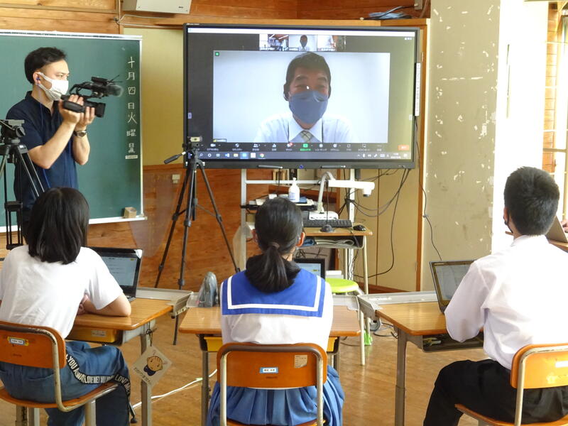 福岡県宗像市教育委員会及び宗像市立大島学園より5名の皆様に来校いただきました。宗像市立大島学園は本校と同じ規模の義務教育学校で、今年2月に本校から2名の職員が視察させていただいた学校です。本日は、学校の概要を説明したり、子どもたちの様子を見ていただきました。また、今後の連携等についても短い時間ではありましたが、協議することができました。