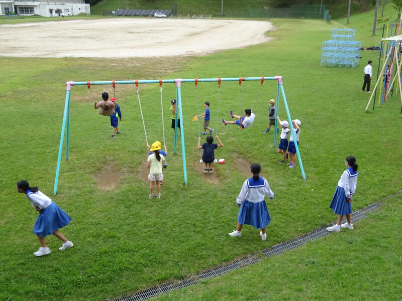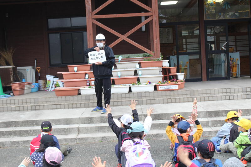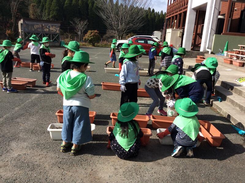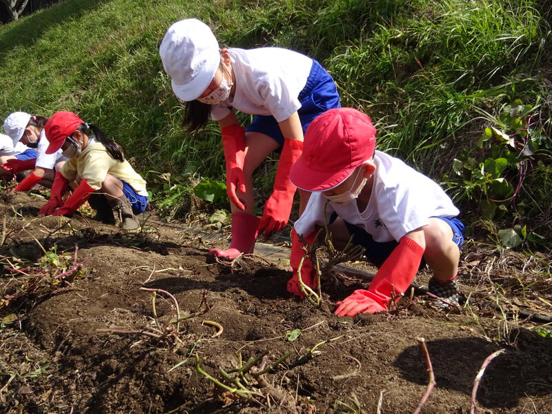 今日は、学校隣の保育園の園児のみなさんが、芋の苗植えに来てくれました。先日、1・2年生が植えた隣の畑に協力して植えることができました。