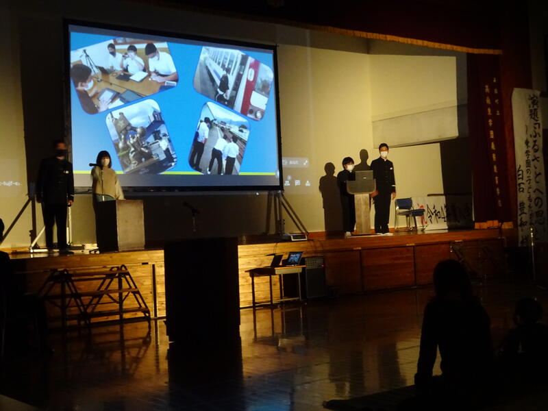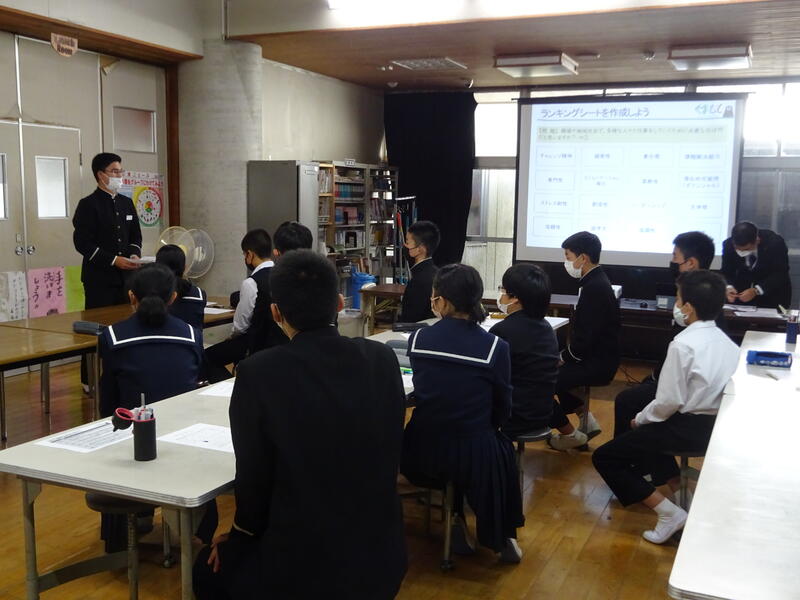 Lブロック集会の様子です。Lブロックでは、自分や自分の家族などについて伝える活動をしています。発表の後は、聞いていた生徒から返し(感じたこと、自分や家族のことなど)がありました。