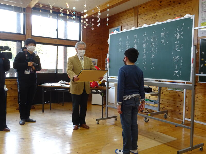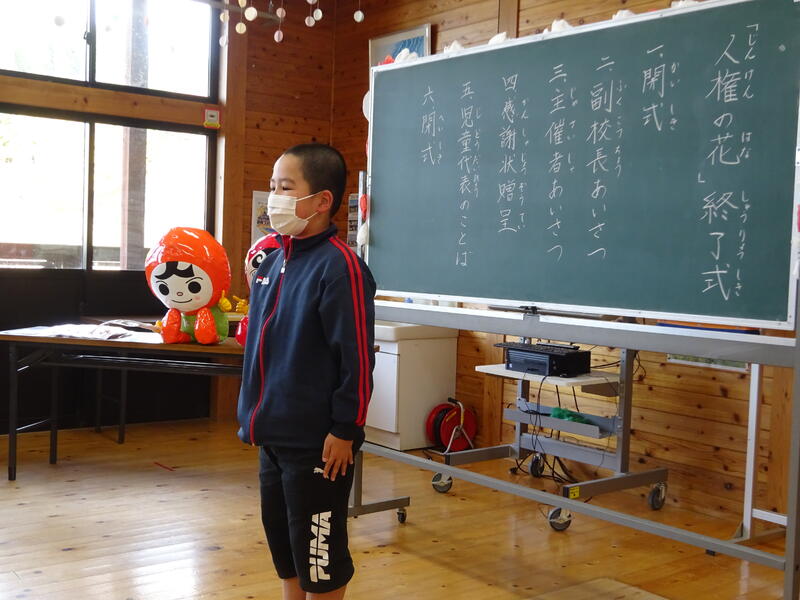 子ども人権委員長さんや法務局、町住民福祉課から来校いただき、「人権の花」終了式を行いました。5月にいただいたマリーゴールドを植え、水をかけたり、草を取ったりと子どもたちはこれまでお世話をしてきました。そのマリーゴールドが今でも元気に咲いています。うれしいですね。今回の取組を今後に生かしていきたいと思います。関係者の皆様、ありがとうございました。
