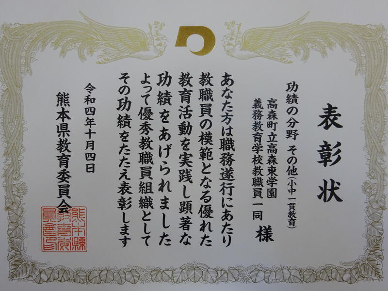 先日の阿蘇郡市教育長・校長等合同会議で優秀教職員組織表彰(小中一貫教育)を受けました。義務教育学校として、小中一貫教育に取り組んできたことを評価していただきました。