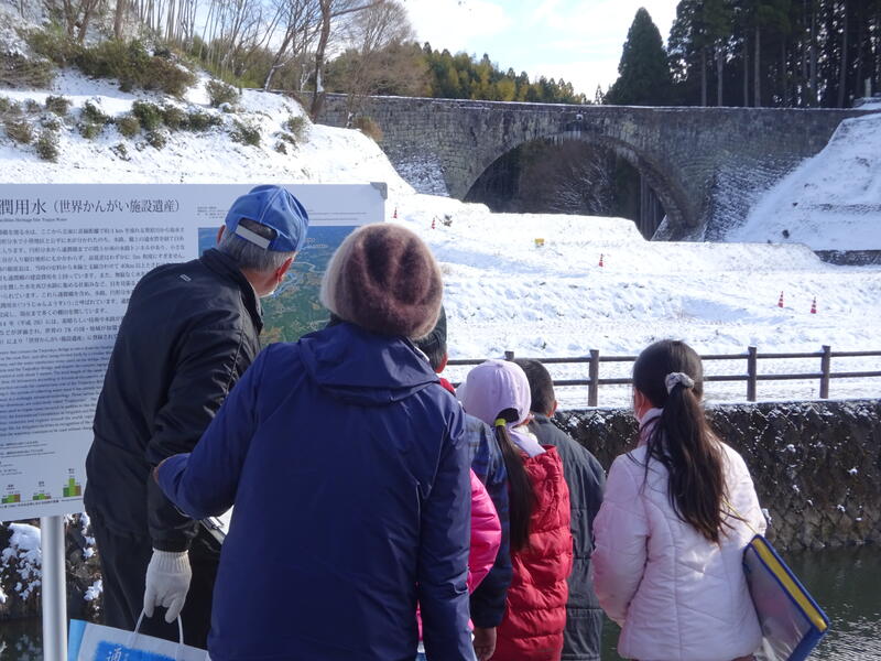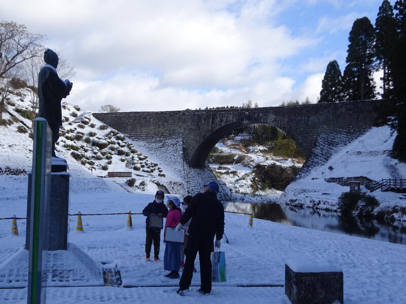 今週月曜日に、4年生が円形分水や通潤橋を見学しました。ガイドの下田さんに円形分水や通潤橋の大きさや役割、布田保之助さんの思い等について詳しく説明していただきました。雪の中でしたが、子どもたちは意欲的に学習しました。