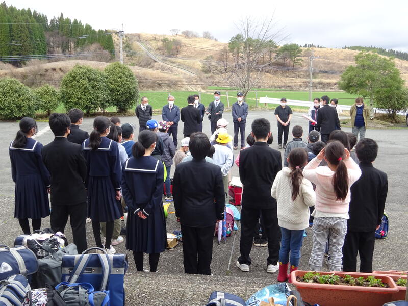 本日朝は高森中央小学校と連合で、結団式を高森中央小学校のスクールバス乗車場で行いました。元気に5名 出発しました。
