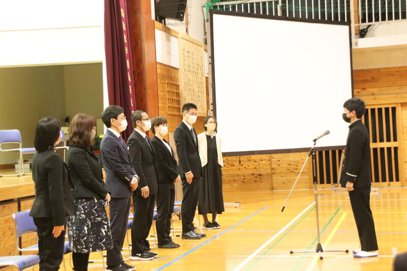 表彰は、バドミントン関係を行いました。また、先日お知らせしたとおり、バドミントン部が男子団体及び男子ダブスルの部で県中体連大会に出場する予定です。推戴式では、県大会で悔いのない試合ができるようにみんなで応援しました。県中体連大会は今週末22日・23日です。活躍を期待しています。