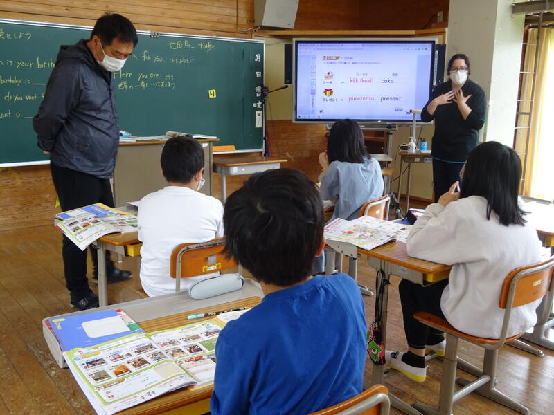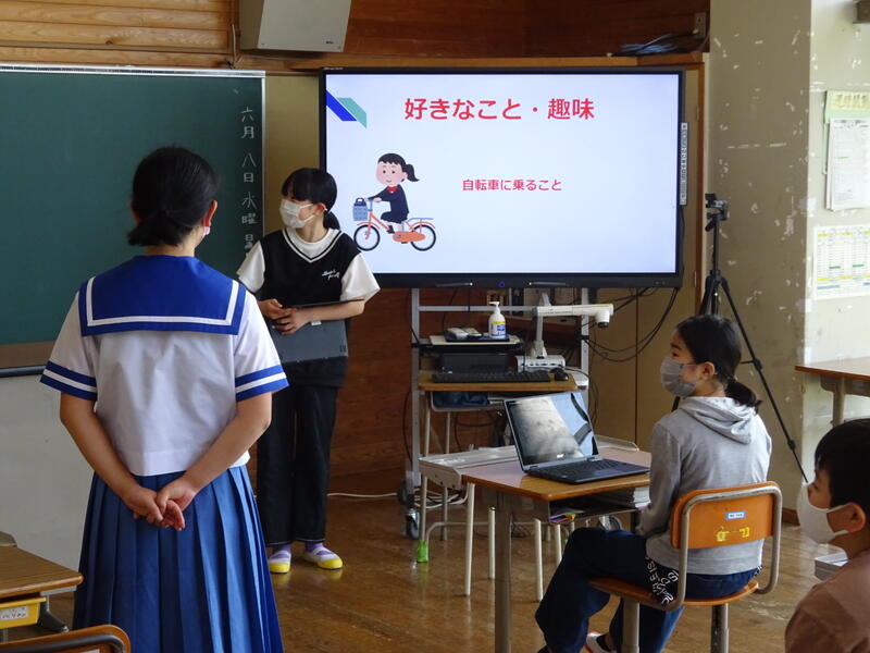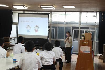 6年生の外国語の様子です。ミッシェル先生(ALT)と一緒に学習し、海の亀と陸の亀の呼び方の違いなどを学びました。