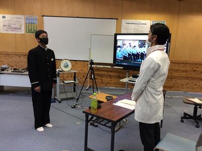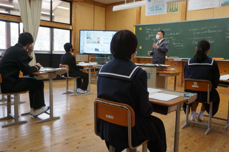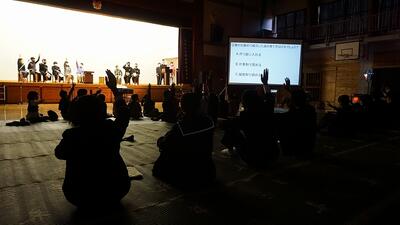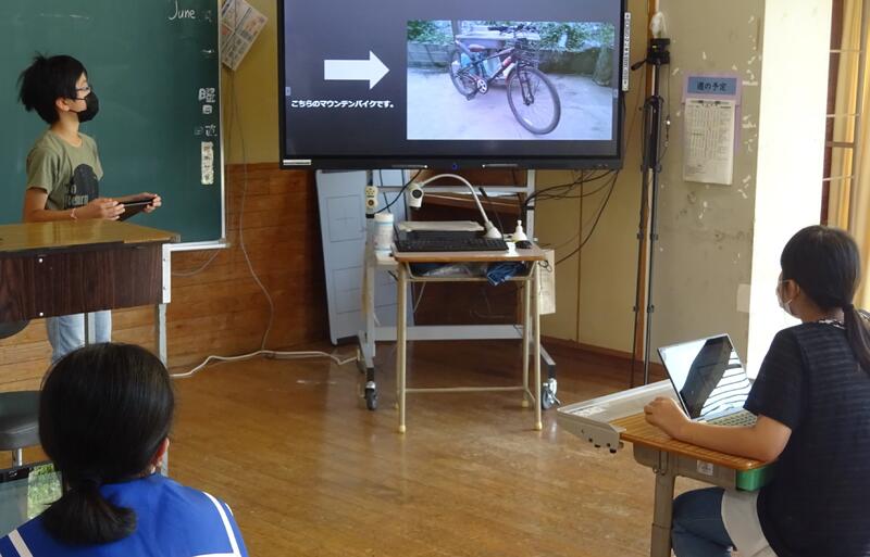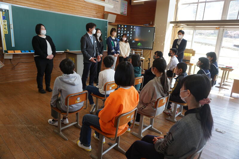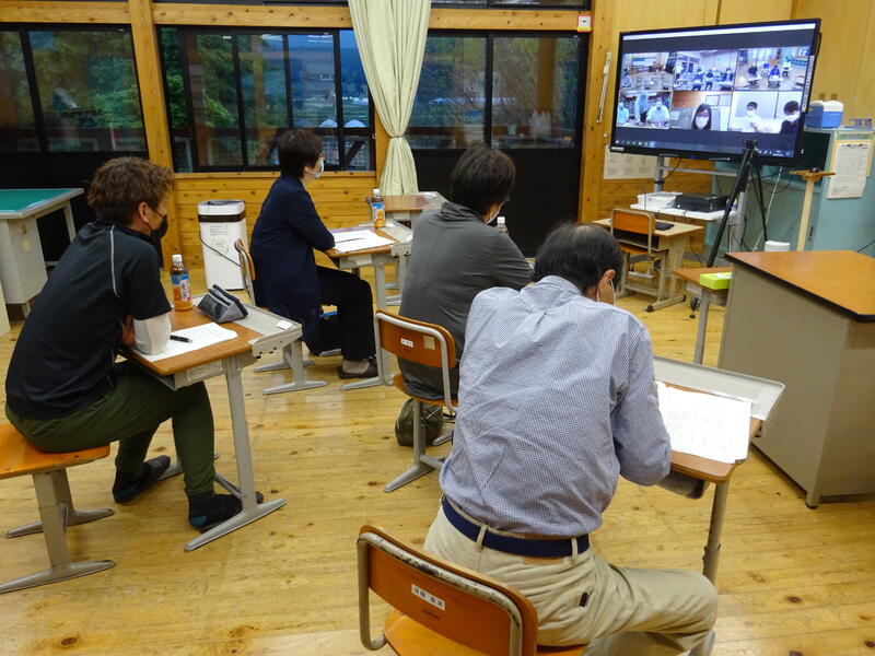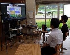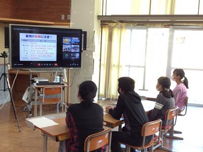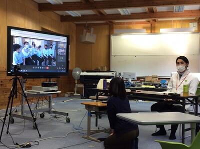 協働学習室から各教室をテレビ会議システムでつないで実施しました。