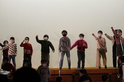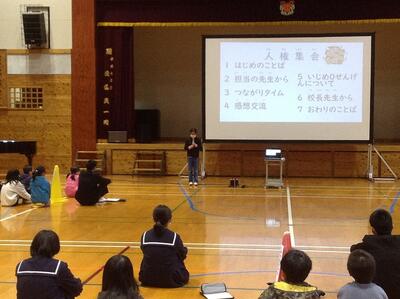 12月17日 2学期の人権集会が行われました。1~9年生全校での集会は、東学園ならではの取組です。縦割りのグループを作り、全員で取り組める内容を毎回企画されています。急な冷え込みで、体育館はとても寒かったのですが、心はポカポカになる集会でした。