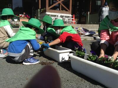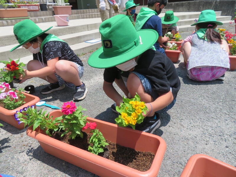 前期課程の緑の少年団活動が11/17に行われました。秋の花植えは、パンジーやビオラ、チューリップなど。6年生のリードで1年生も楽しく活動できました。