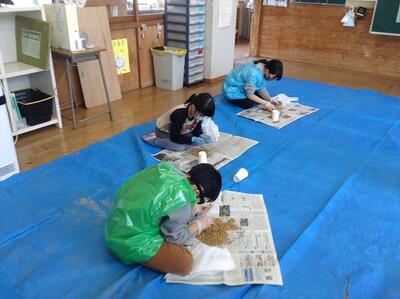 1・2年生は、地域の芹口さんに栃の実笛の作り方を教えてもらいました。栃の実に穴を開けて中の実をくりぬきました。穴から息を吹き込むと、高い音や低い音が出ていました。その他、竹笛や竹鉄砲についても教えてもらいました。子どもたちは、とても楽しい時間を過ごしました。芹口さん、ありがとうございました。