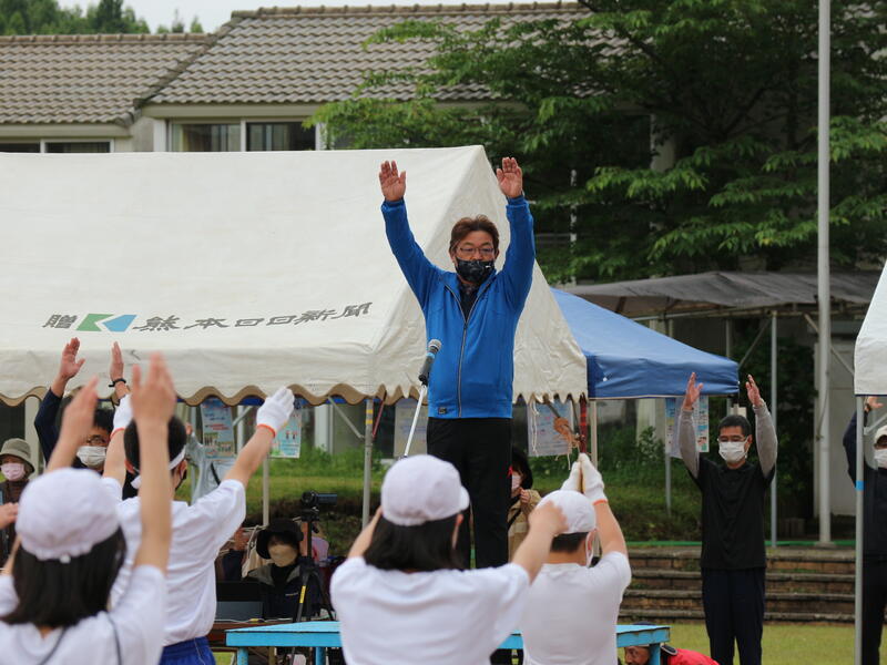 本校で出発式、高森中央小で結団式を行い、水俣へ出発しました。